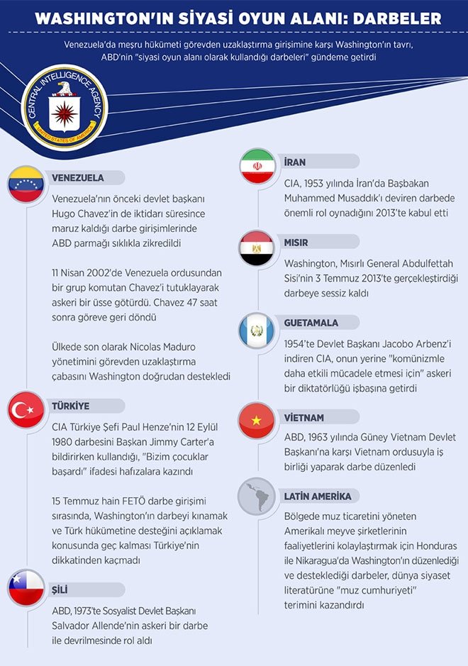 Venezuela’da meşru hükümeti görevden uzaklaştırma girişimine karşı Washington’ın tavrı, ABD’nin “siyasi oyun alanı olarak kullandığı darbeleri” gündeme getirdi. ABD, dünya çapında, Soğuk Savaş öncesinde ve sırasında uluslararası arenada, çıkarlarına uygun aktörleri destekleyerek meşru yönetimlere müdahale etti. Washington, Doğu Bloku’nun yıkılmasının ardından da darbe girişimleri karşısında çıkarlarına göre tavır aldı. Geçmişten günümüze, olayların perde arkasında ABD yönetiminin olduğu darbeler…