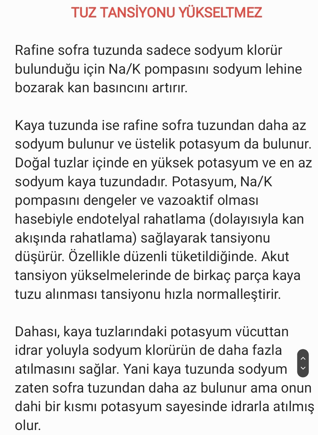 İşin enteresan yanı, doğal tuzlar (bunların neler olduğuna birazdan değineceğim) bilakis yüksek tansiyonu engellerler. Hatta doğal tuzlar hipertansiyon hastalarında dahi tansiyonu düzenler çünkü mineral dengesi sağlarlar.Özellikle içeriğindeki potasyum tansiyonu dengeler.