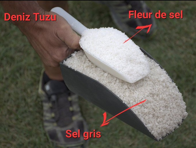 Tuzlu su havuzda kurutulurken üst kısımlardan alınan tuzlar (fleur de sel) daha beyaz ve hafif nemlidir. 64 ila 84 arasında mineral içerirler fakat oransal olarak çok zengin değildir, ağırlıklı olarak sodyum klorür içerirler.Ama neminden ötürü tadı damakta daha uzun süre kaldığı için diğer tuzlara göre daha pahalıdır.Altta kalan tuz (sel gris) ise mineral oranı bakımından az daha zengindir ama aynı zamanda daha yüksek oranda ağır metal içerme riski taşır.Rengi,mineral oranı ve sudaki alglerle de etkileşime girmiş kısımları olmasından ötürü açık gri ve uçuk yeşilimsi tonlar barındırır. Türkiye’de deniz tuzu Çamaltı’nda ve Ayvalık’da, kaynak tuzu Delice ve Kemah’da, göl tuzu Palas gölü, Seyfe gölü, Tuz gölü ve Van’da üretiliyor. Kaya tuzu ise Çankırı, Iğdır, Nevşehir ve Yozgat’da üretilmekte