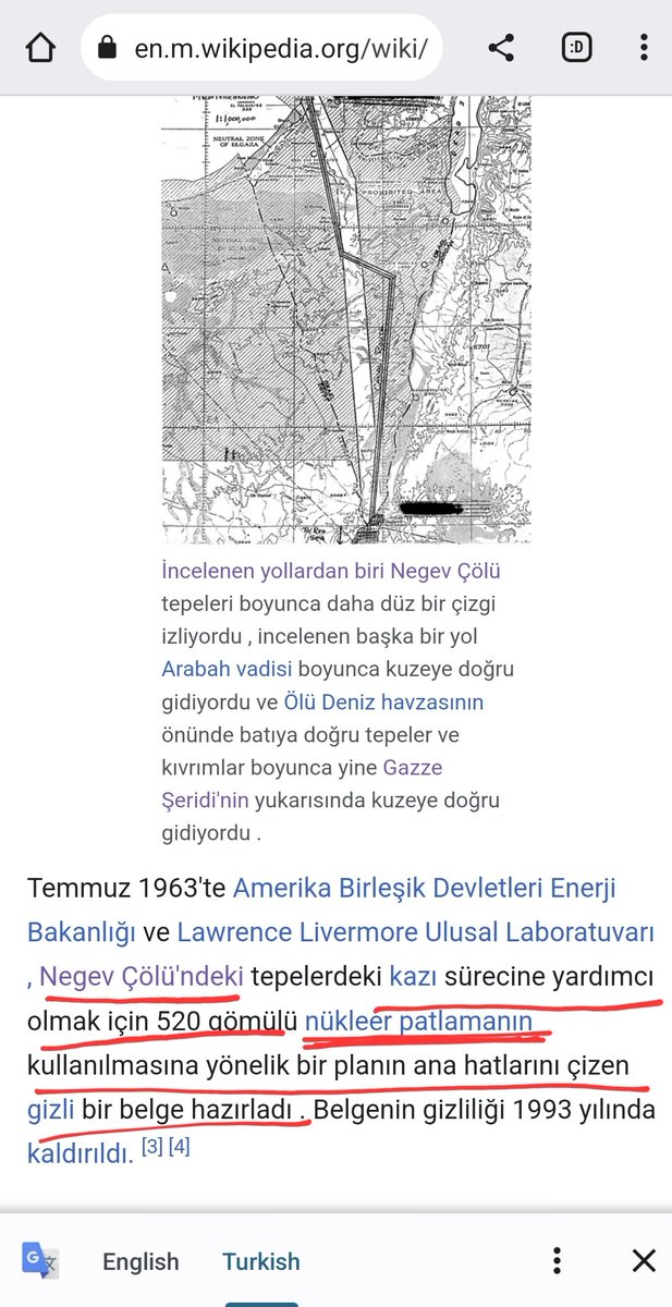 Bu arada kanal projesi planlanırken çöle gömülü olan çok sayıda nükleer bombanın patlatılarak yeryüzünde dev bir oyuk oluşturulması suretiyle iki denizin birbirine kavuşması düşünülmüş.