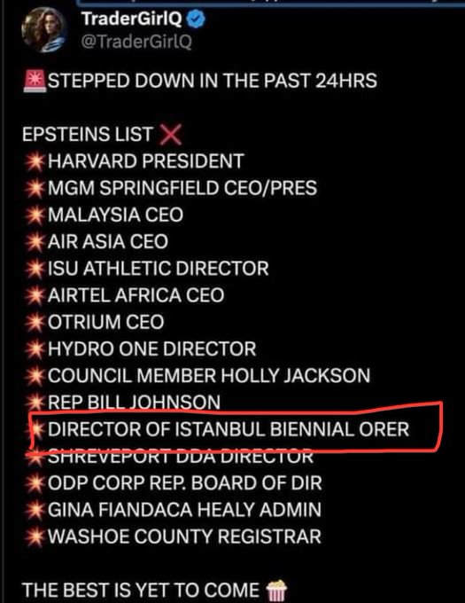 Listeyi Şu An Eke Bırakıyorum. Ben Listede Bir Türk Bayan İsmi Gördüm. Listeden Bayan’ın İsmi Banu Kucuk Koylu 24 Ağustos 2001 Yılı ,B 727 31 Özel Yolcu uçağı ile Jeffrey Epstein ve GM isimli kişlerle 3 kez Adaya ziyaret etmiş. Araştırmalarımda Eski Türkiye 3 Güzeli Banu Küçük Köylü Çıkıyor.(Emin Olmamak Şartıyla) Ve Araştırma Yapılması Gerektiğine İnanıyorum. Tarih belli 3 Kez,Bu Adaya giriş yapılmış Bu tarihlerde Kendisi Nerdeymiş…? Çünkü Bu Adaya Binlerce çocuk kaçırıldı.