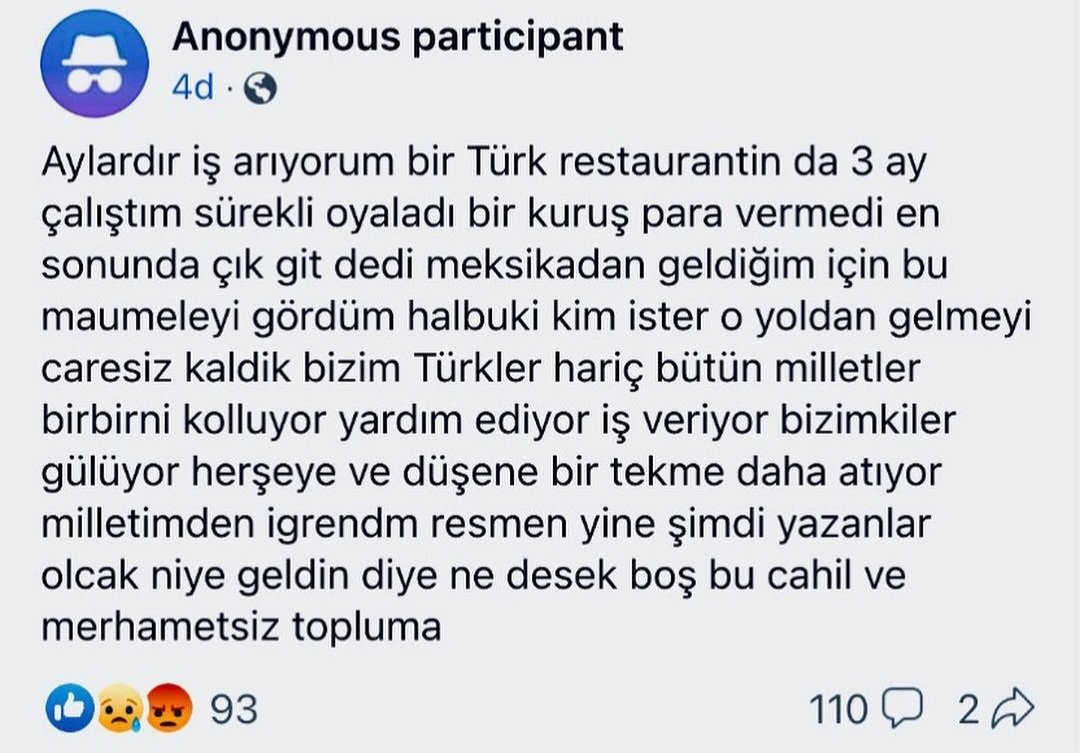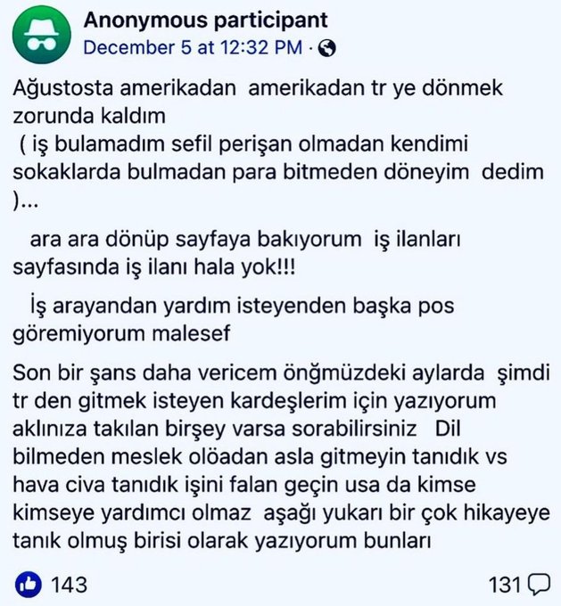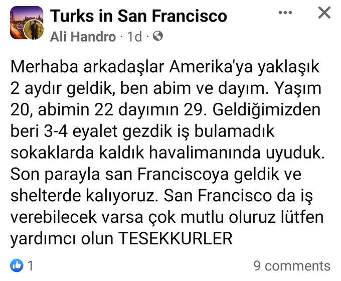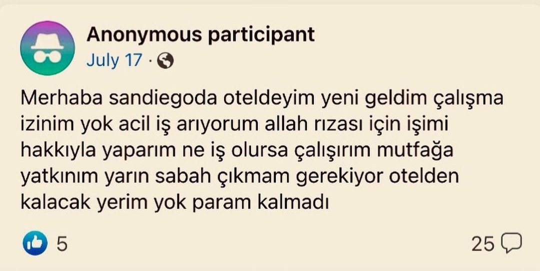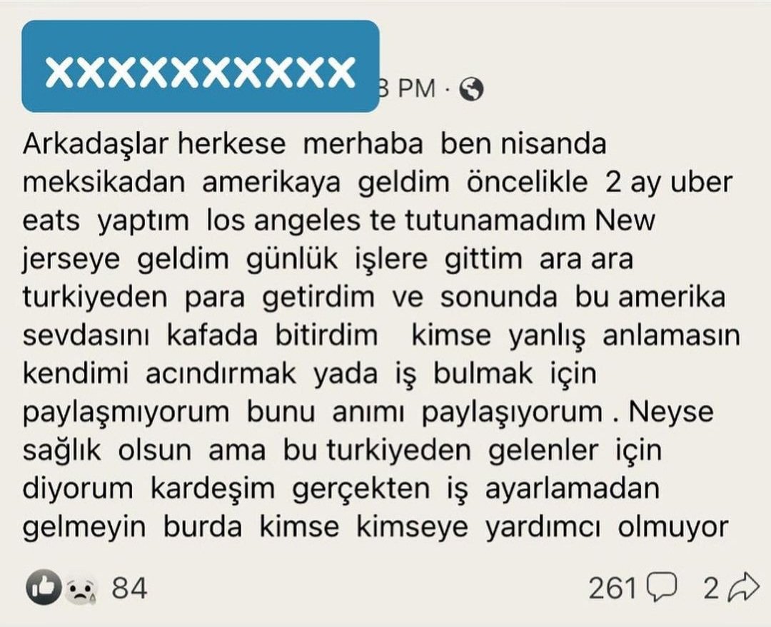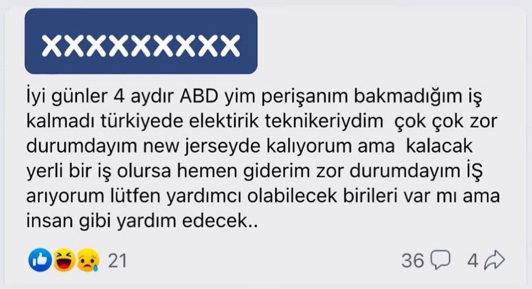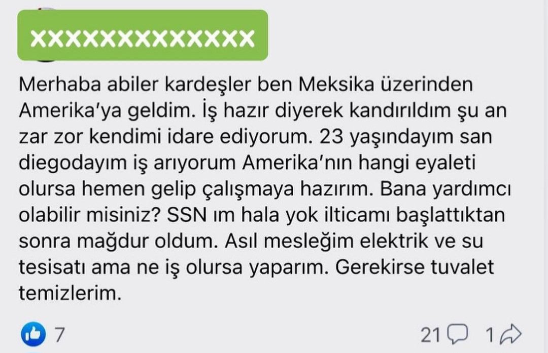 Türkiye’ye gelen kaçak göçmenleri uzun uzun konuştuk. Ama Türkiye’den diğer ülkelere giden kaçak göçmenler ise nedense gündeme gelmiyor. Son 2 senede, benim tahminime göre en az 100.000 Türk, diğer ülkelere kaçak yollarla girerken, bunların çoğu da iltica başvurusunda bulundu. İltica başvurusunda en çok dile getirilenler “Kürt olduğum, Alevi olduğum, Ateist olduğum, Gay olduğum için Türkiye’de baskıya uğruyorum, hayatım tehlikede” gibi gerekçeler oluyor. Özellikle Meksika üzerinden Amerika’ya geçenler, toplam Turk kaçakların tahminimce %70’ini oluşturuyor. Bunların bir kısmı Amerika’da kalırken; bir bölümü de Kanada’ya geçerek, iltica başvurusunu bu ülkeye yapıyor. Bunun sebebi de, Amerika’nın zaman zaman iltica başvurularını reddederek, kaçakları deport etmesi. Kanada ise hemen hemen tüm başvuruları kabul ediyor. Ayrıca bu macera için kişi başı ortalama 10.000 $ ücret ödendiğini düşünürsek, Türk kaçakların bu maceraya harcadıkları paranın toplam 1 milyar Dolar seviyesinde olduğunu söyleyebiliriz. Peki bu kaçakları buralarda ne gibi yaşam koşulları bekliyor? En büyük sorun, İngilizce bilmemeleri elbette. Çoğunun İngilizce bilgisi başlangıç seviyesinde bile değil. Bu nedenle kaçak işçi çalıştıran yerlerde bile iş bulmaları çok zor oluyor. Genellikle 2,3 hatta 4-5 kişilik küçük gruplar halinde hareket ettikleri için, iş ve kalacak yer bulma imkanları daha da azalıyor. Ancak tek başlarına mücadele edebilmeleri de çok zor olduğundan, bir paradoks içinde debeleniyorlar. Şimdi takip eden mesajlarda, son günlerde sosyal medyaya yansıyan, Türk kaçakların feryatlarını kimlik belirtmeden paylaşıyorum. İçinde oldukları vaziyeti, bizzat kendi ağızlarından dinleyelim: