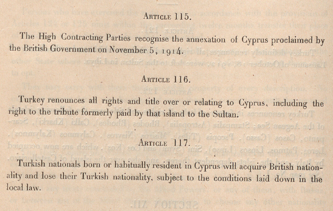 Lozan Madde 20/21 – Sevr Madde 115/116/117 İngilizler 1914’te Kıbrıs’ı ilhak etmiş. Sevr’de ve Lozan’da bunu onaylatmış, İngiltere’nin dediği olmuş. Sultan’a ödenen vergi de iptal edilmiş. Kıbrıs’taki Türk vatandaşları İngiliz yapılmış. Kıbrıs elimizden Lozan’la çıkmış…