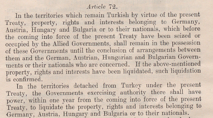 Lozan Madde 72 / Sevr Madde 296 Almanya, Avusturya-Macaristan ve Bulgaristan’a ait mallara el konabileceğine dair maddeler her iki anlaşmada da aynı. Sevr daha net biçimde cümlelendirilmiş. Lozan’da ise bir anlaşma olana kadar dondurulsun, önceki el koymalar geçerli diyor.