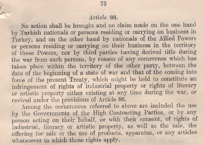 Lozan Madde 87 / Sevr Madde 282 (ve devamı) Yine telif hakları patent haklarının geri iadesine dönük uygulamaları içeren maddeler. Nerdeyse paragraf paragraf copy paste yapılmış Sevr’den.